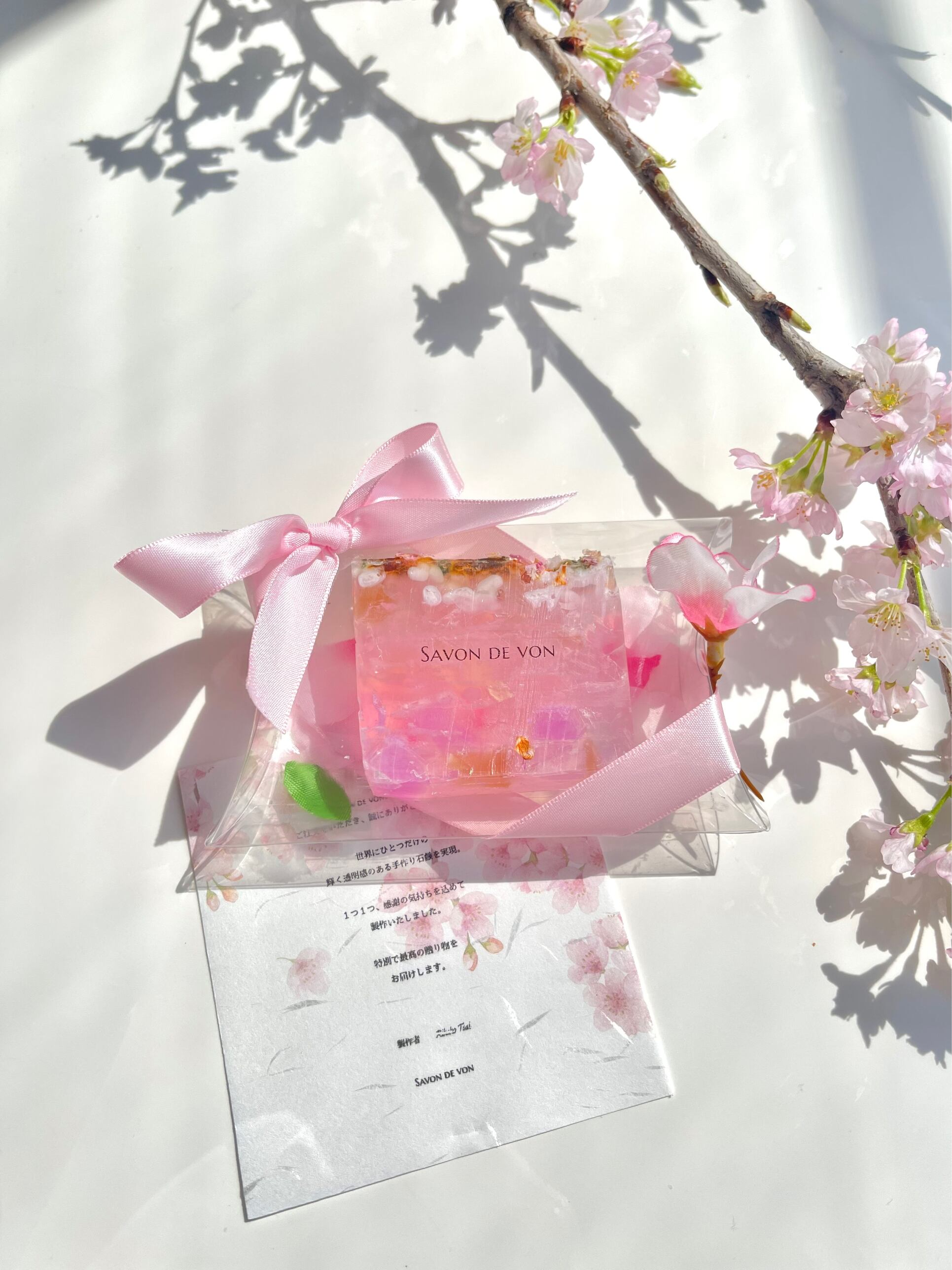 丁寧に採取された天然の桜と、ヒマラヤン岩塩&エプソム塩を、保湿成分たっぷりの宝石石鹸に散りばめました。